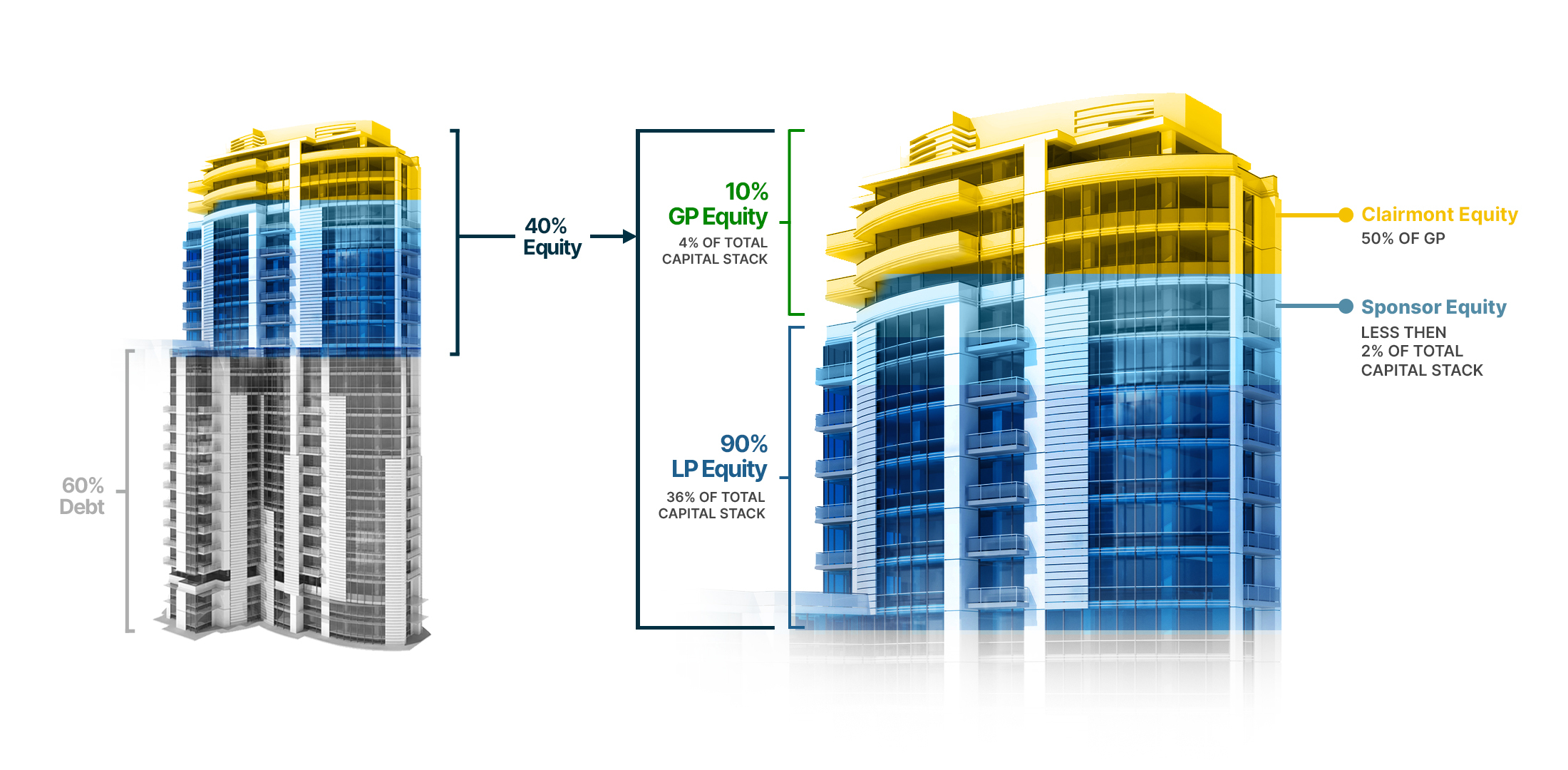 Clairmont will typically contribute 50%+ of the GPs 10% equity (between 2% to 4% of the total capital stack) and structure its investment to include participation in the GP’s promote.